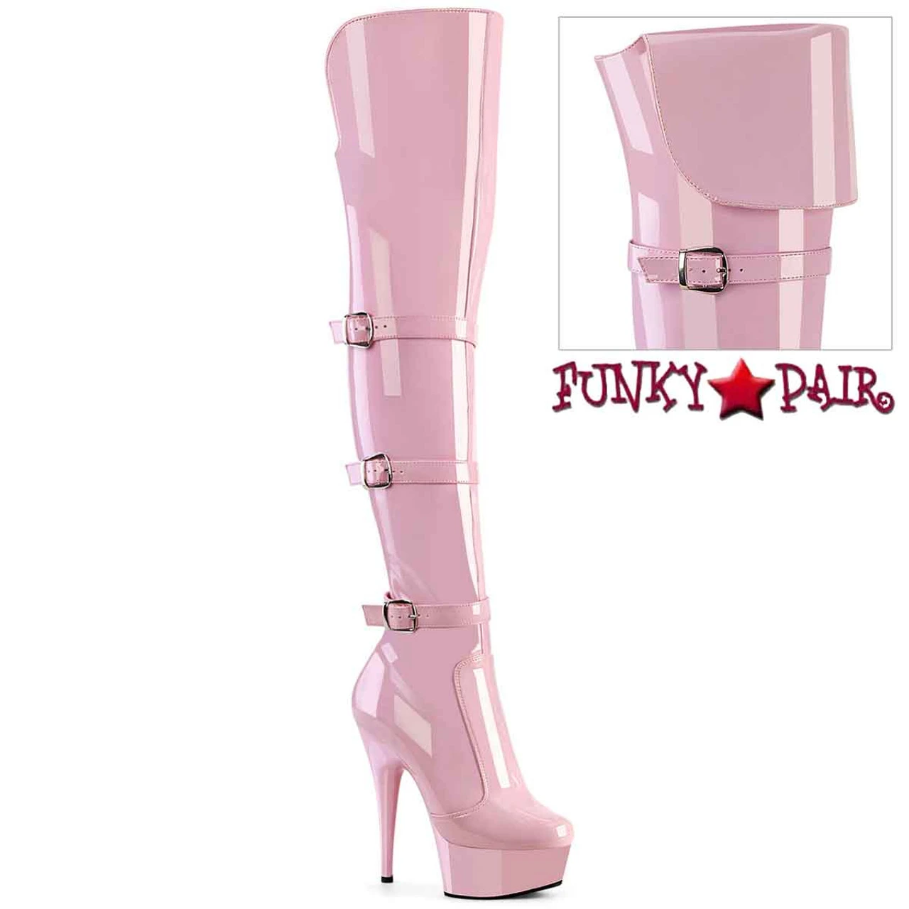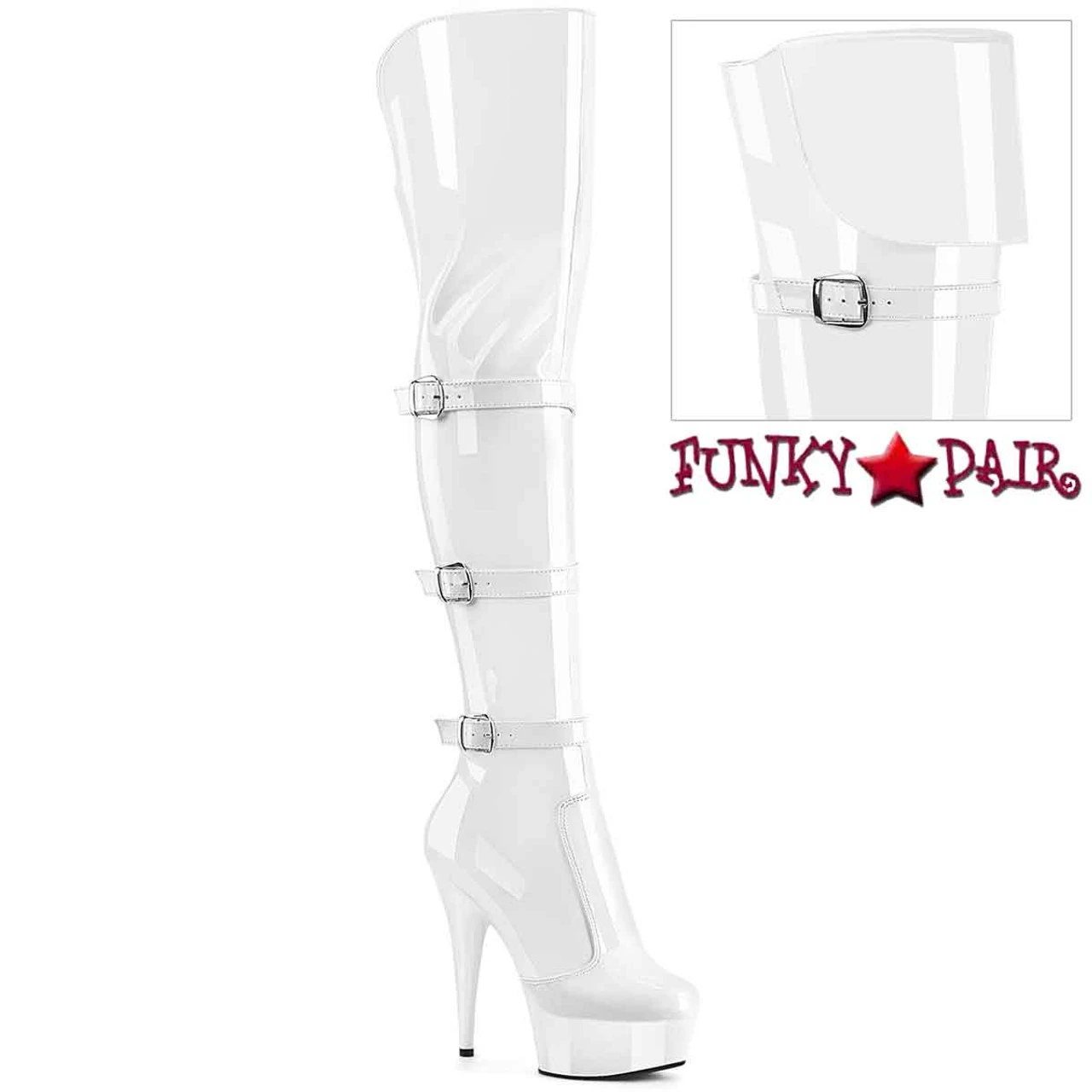 6″ (152mm) Heel, 1 3/4″ (45mm) Platform Triple Buckle Strap Stretch Over-The-Knee Boot, 2/3 Inner Side Zip Closure