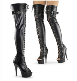 Pleaser Delight-3025 Approximately 6 Inch (15.25cm) Heel, 1 3/4 Inch (4.5cm) Platform Peep Toe Front Lace-Up Thigh High Boots with Buckled Strap, Full-Length Back Zip Closure