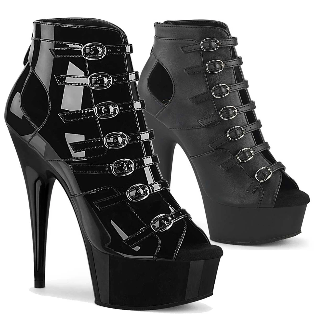 Pleaser Delight-600-11 Open Toe Open Front Ankle Bootie Featuring Multiple Buckles & Side Cutout Detail, Back Zip Closure Approximately 6 Inch (152mm) Heel, 1 3/4″ (45mm) Platform
