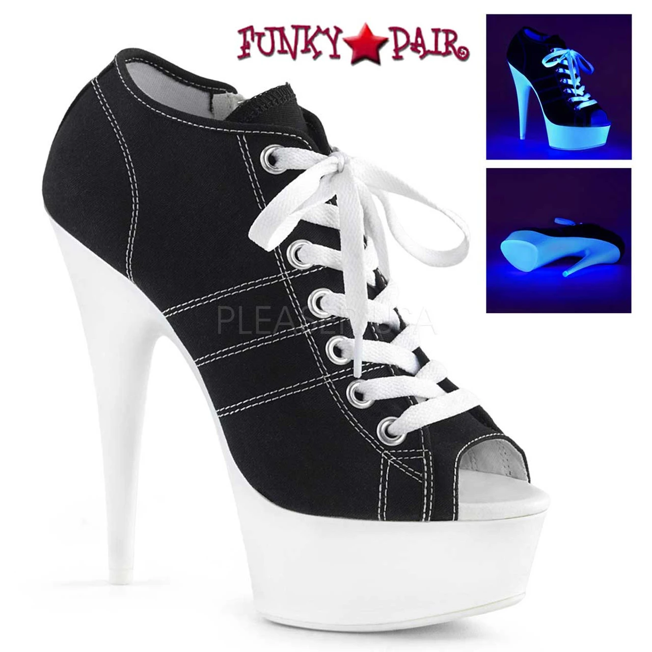 Pleaser Delight-600SK-01 Approximately 6 Inch (152mm) Heel, 1 3/4 Inch (45mm) Platform Open Toe Lace Up Front Canvas Sneaker Ankle Boots Featuring Blacklight Reactive Platform Bottom, Full Inside Zip Closure
