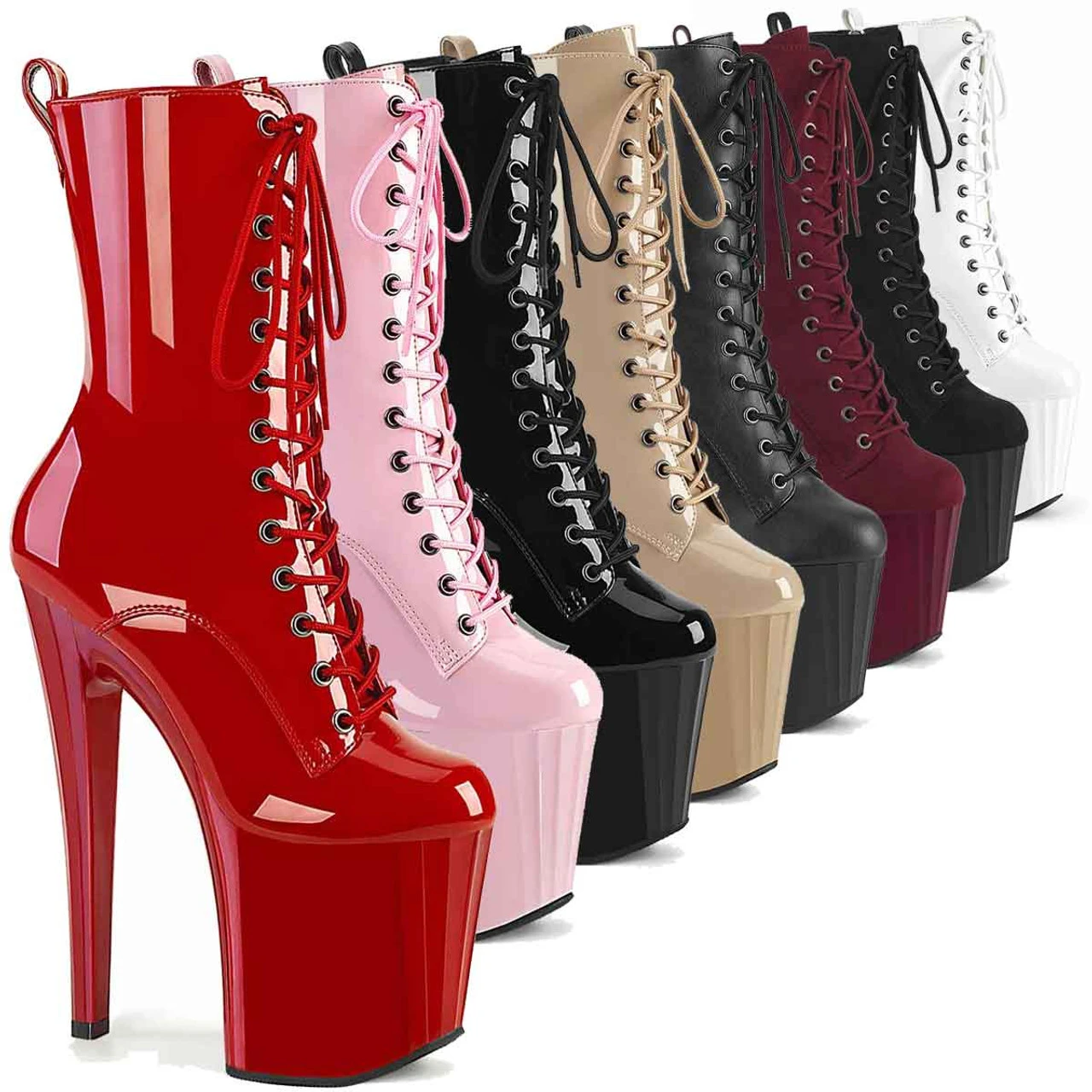Approximately 8″ (195mm) Heel, 3 3/4″ (95mm) Platform Lace-Up Front Mid Calf Boot Featuring Prismatic Linear Design at the Platform Front and Back of Heel, Inner Side Zip Closure