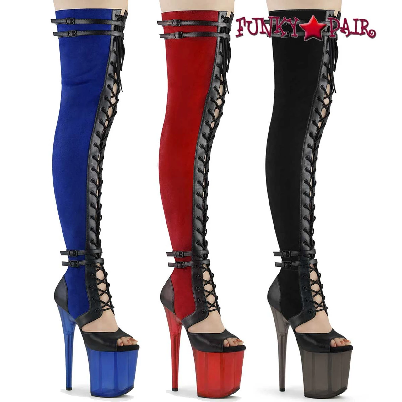 8″ (200mm) Heel, 4″ (100mm) Platform Open Toe Lace-Up Front Sandal Style Thigh High Boot Featuring Dual Buckle Straps at Ankle & Thigh, Full-Length Inside Zip Closure