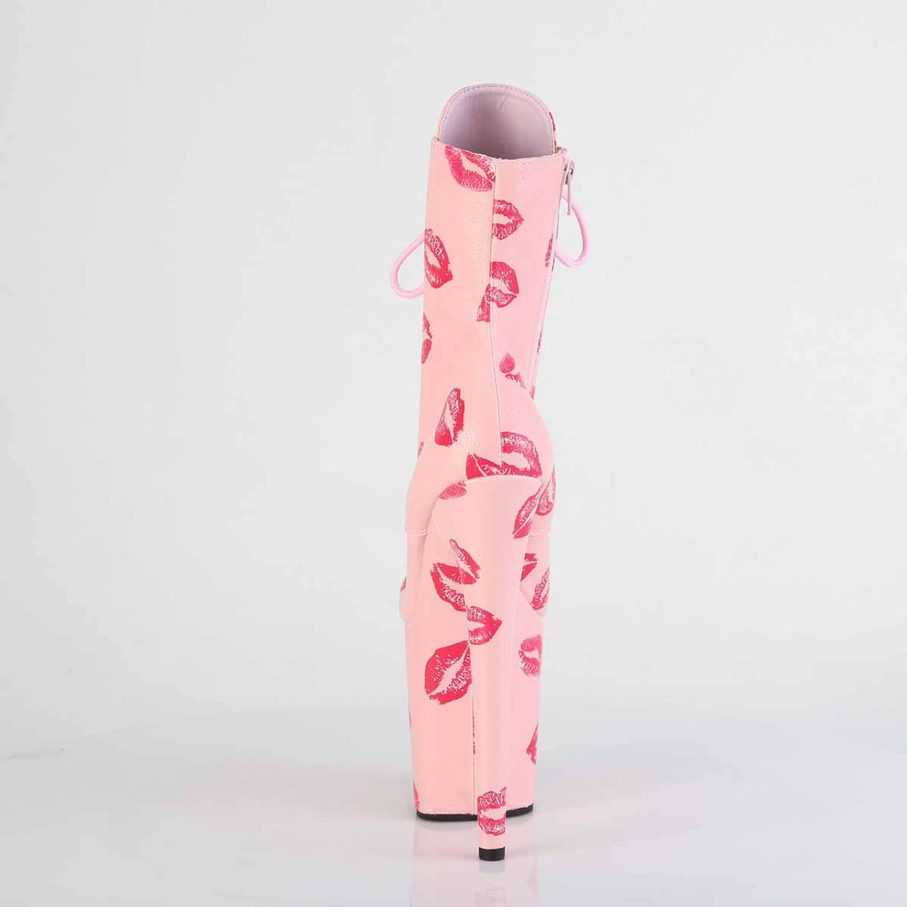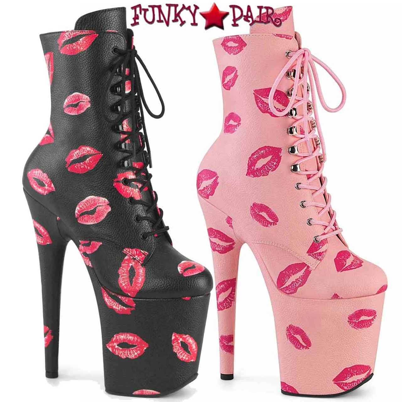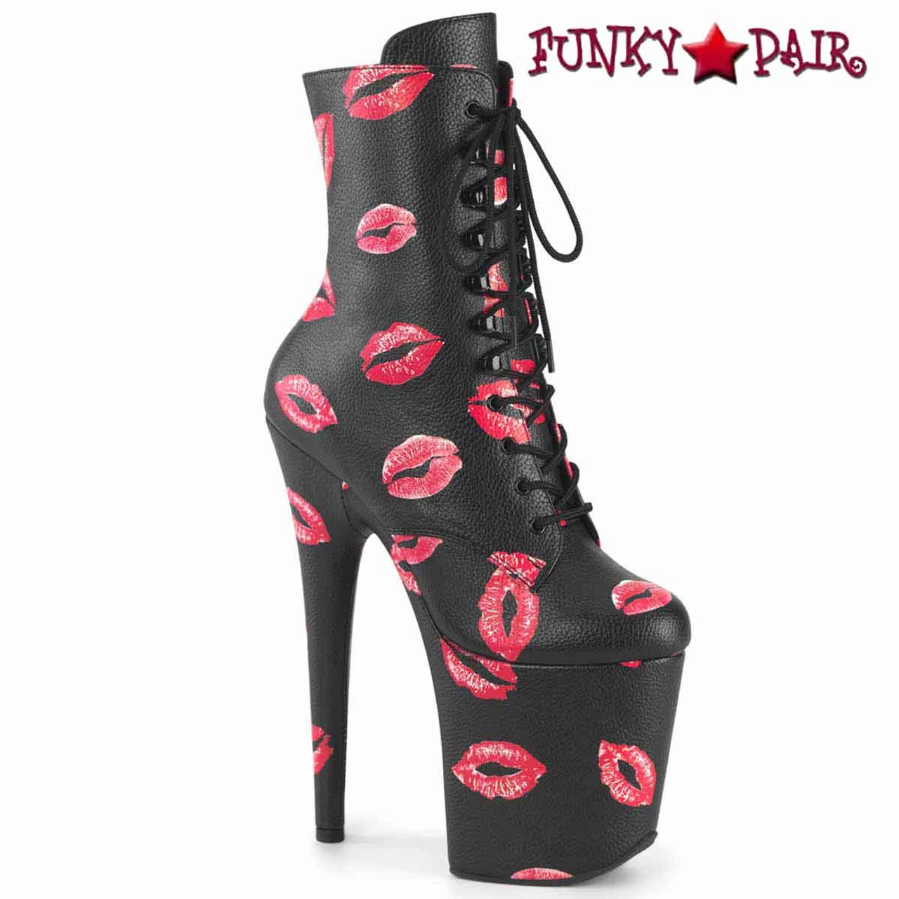 8″ (200mm) Heel, 4″ (100mm) Platform Lace-Up Front Ankle Boot Featuring Red LipS Print Upper and Matching Wrapped Platform Bottom, Inner Side Zip Closure