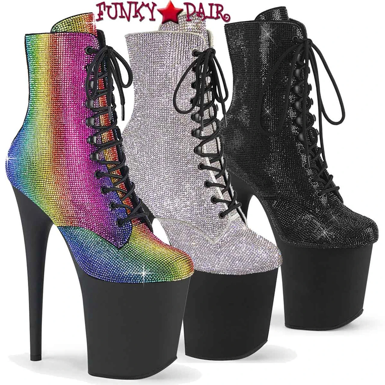 Lace-Up Front Ankle Boot Featuring Allover Blanketed Rhinestone Embellishments on Upper, Inner Side Zip Closure. Approximately 8″ (200mm) Heel, 4″ (100mm) Platform