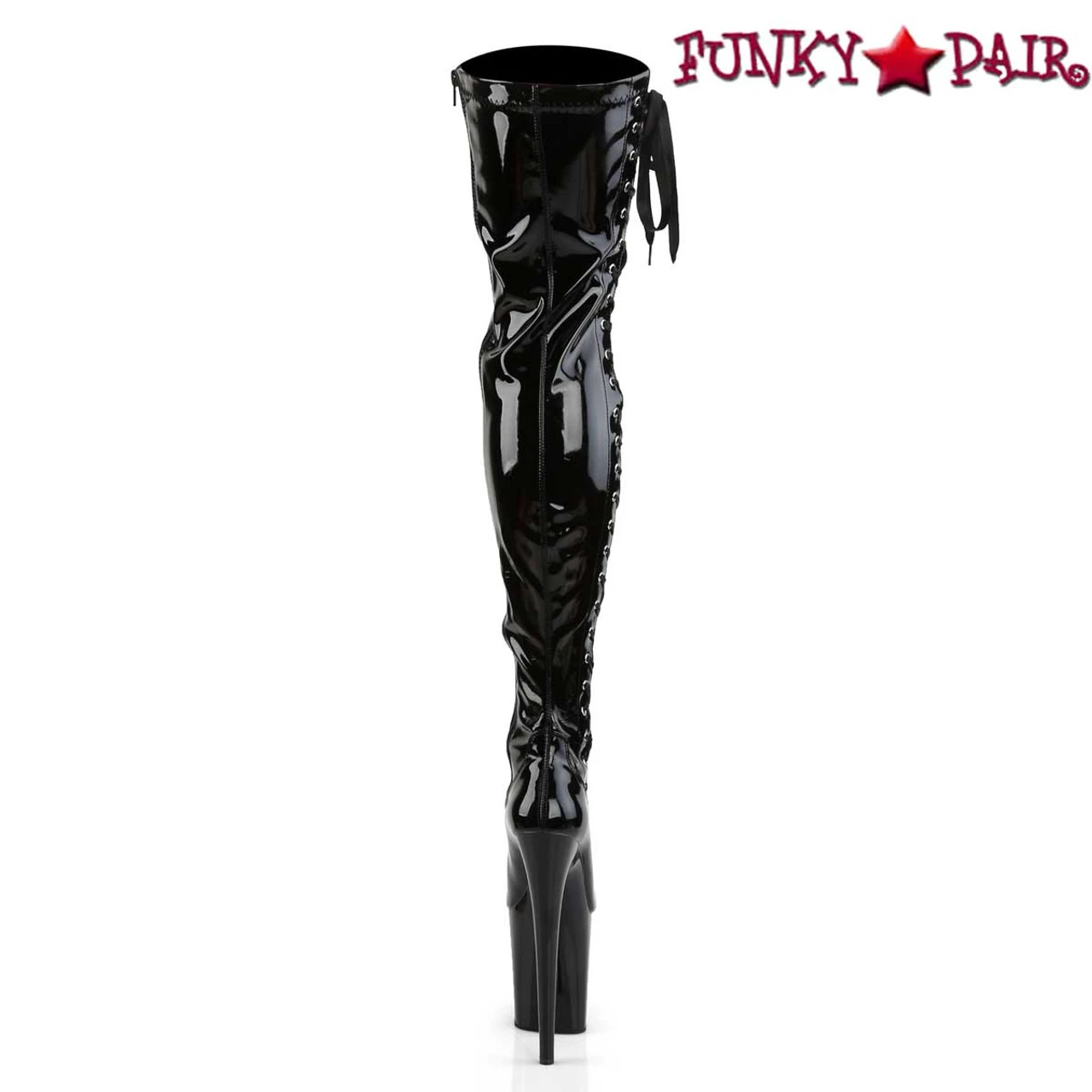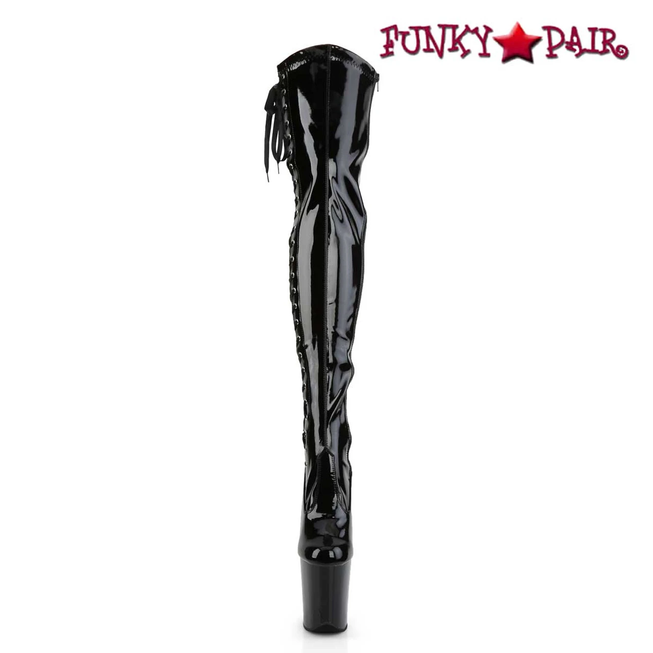 Pleaser Flamingo-3050 Approximately 8 Inch (20cm) Heel, 4 Inch (10cm) Platform Stretch Thigh High Boots With Side Ribbon Lacing, Full-Length Inside Zip Closure