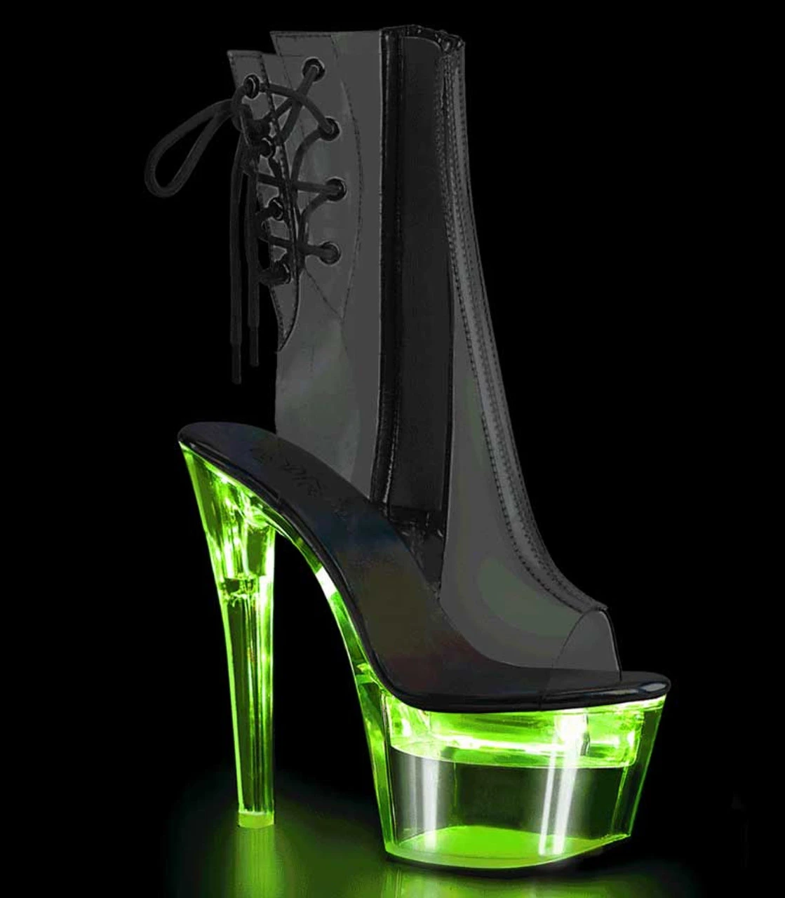 Pleaser Flashdance-1018C-7 Approximately 7″ (178mm) Heel, 2 3/4″ (70mm) Platform USB Chargeable LED Light-Up Open Toe/ Heel Lace-Up Back Ankle Boot w/ Multiple Static/ Changing Color Options and Light Settings