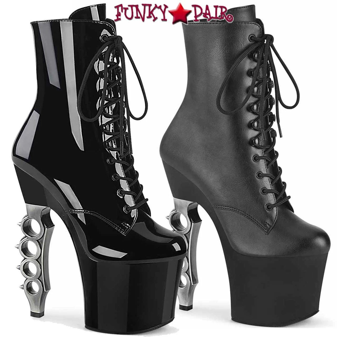 7″ (178mm) Heel, 3 1/4″ (83mm) Platform Lace-Up Front Ankle Boot Featuring Chrome Plated Brass Knuckles Heel, Inside Zip Closure