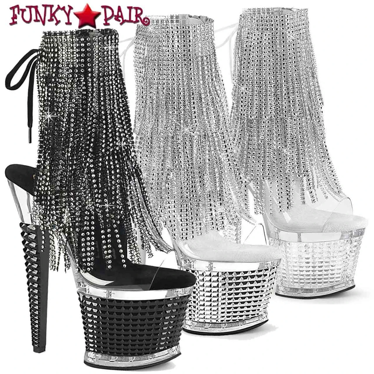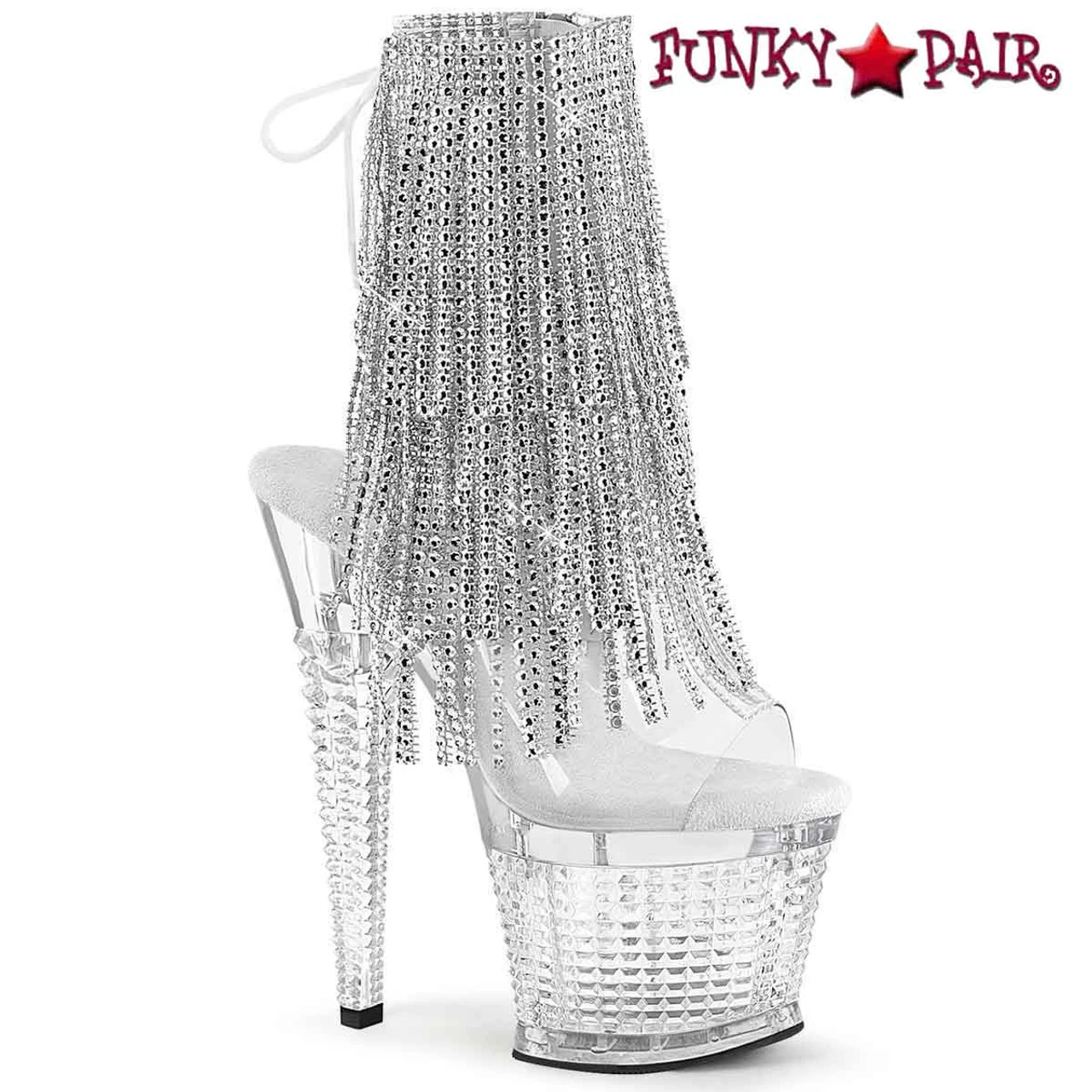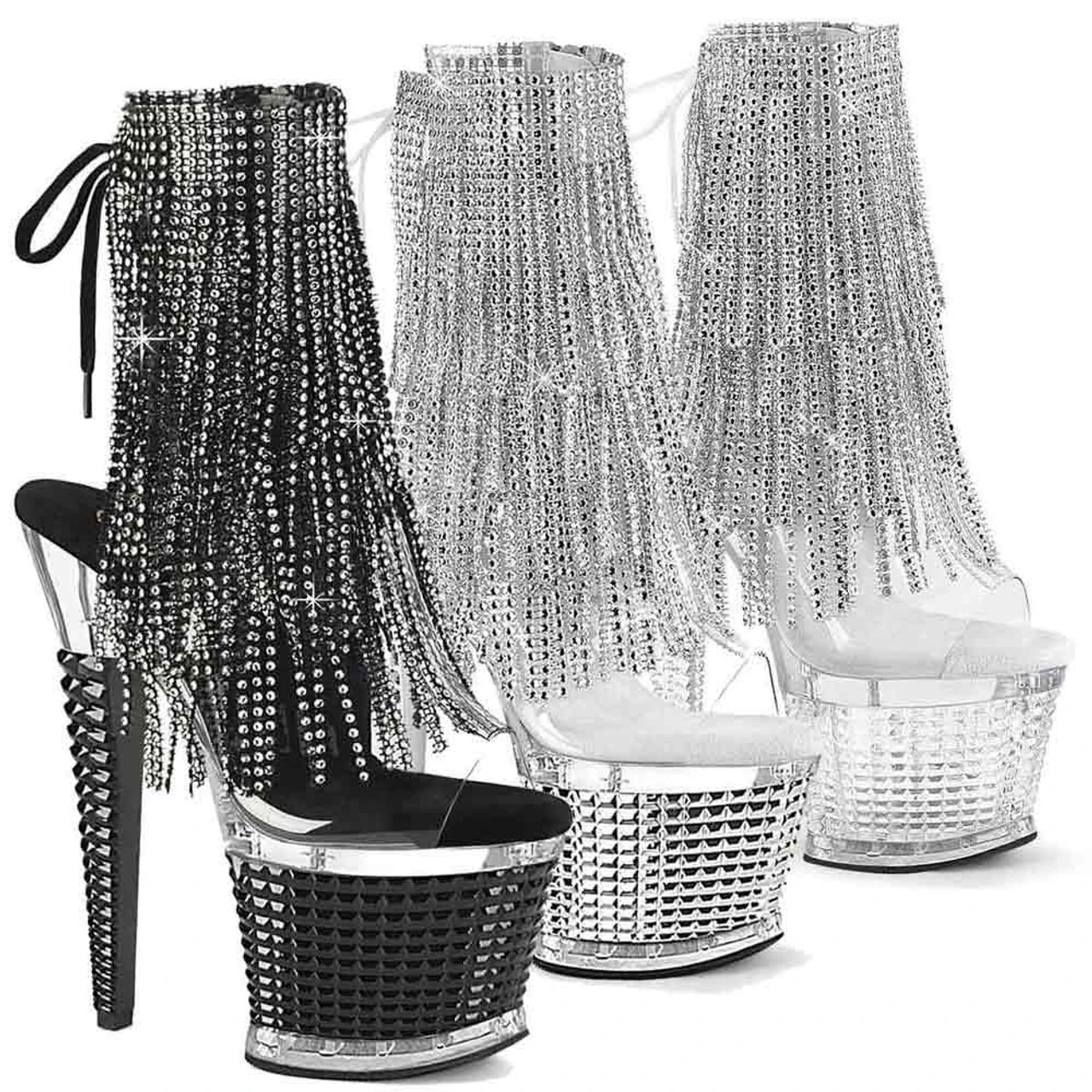 7″ (178mm) Heel, 3″ (75mm) Textured Platform Open Toe/Back Rear Lace-Up Ankle Boot Featuring 4-Layer Chrome Plated Simulated Rhinestone Fringe, Inner Side Zip Closure