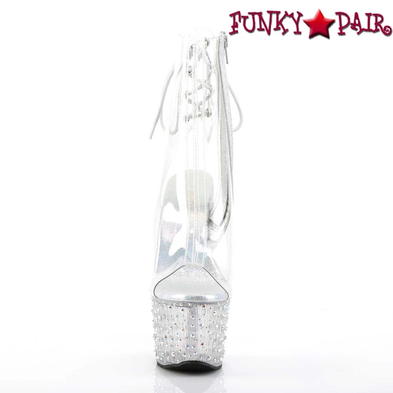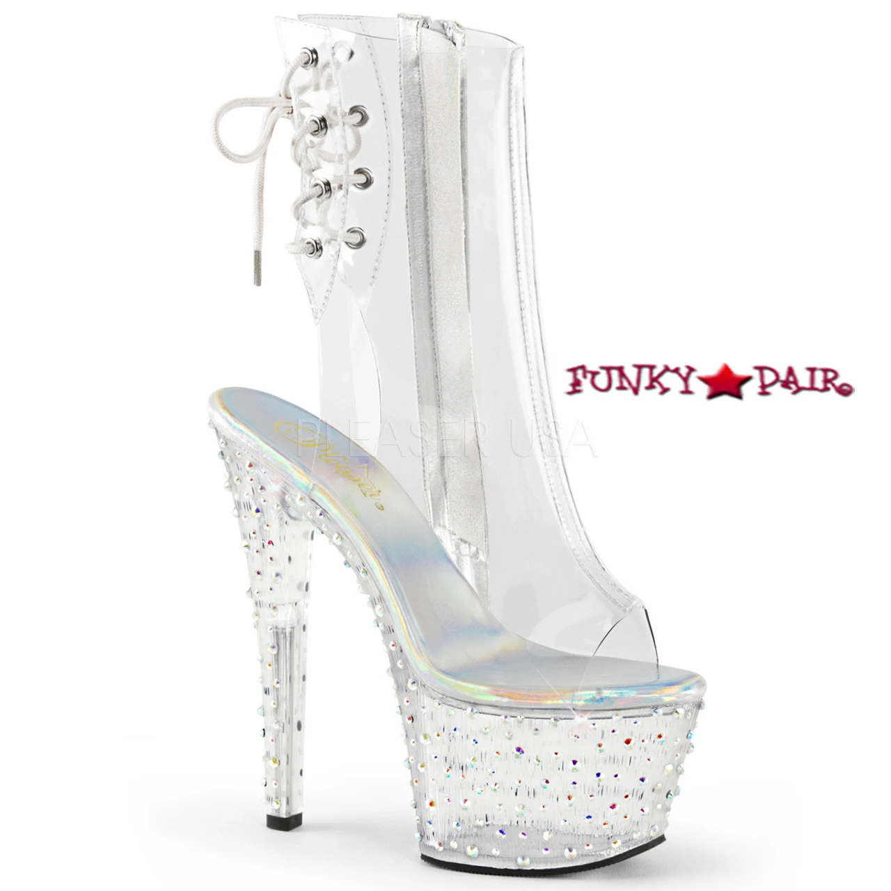 Pleaser Stardance-1018C-7 Approximately 7 Inch (18cm) Heel, 2 3/4 Inch (7cm) Platform Open Toe/Heel Lace-Up Back Ankle Boots Featuring Multi-size RS Encrusted on the Bottom, Inside Zip Closure