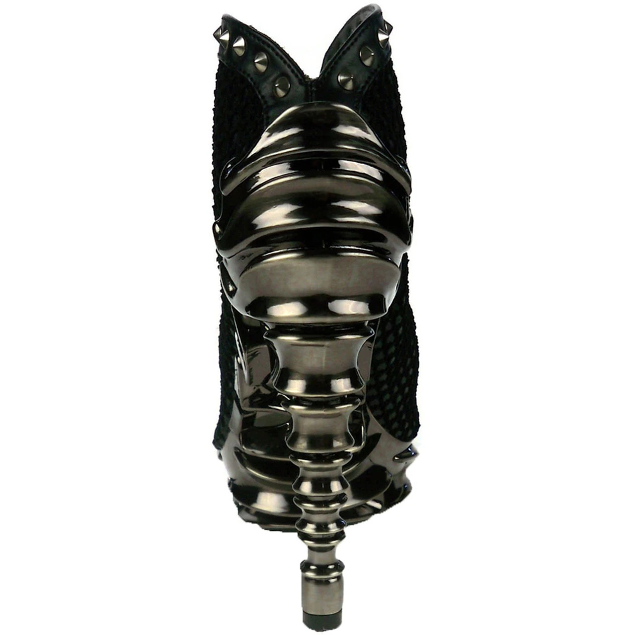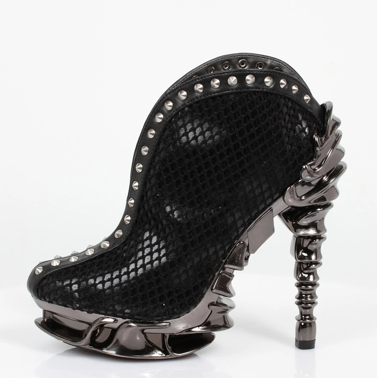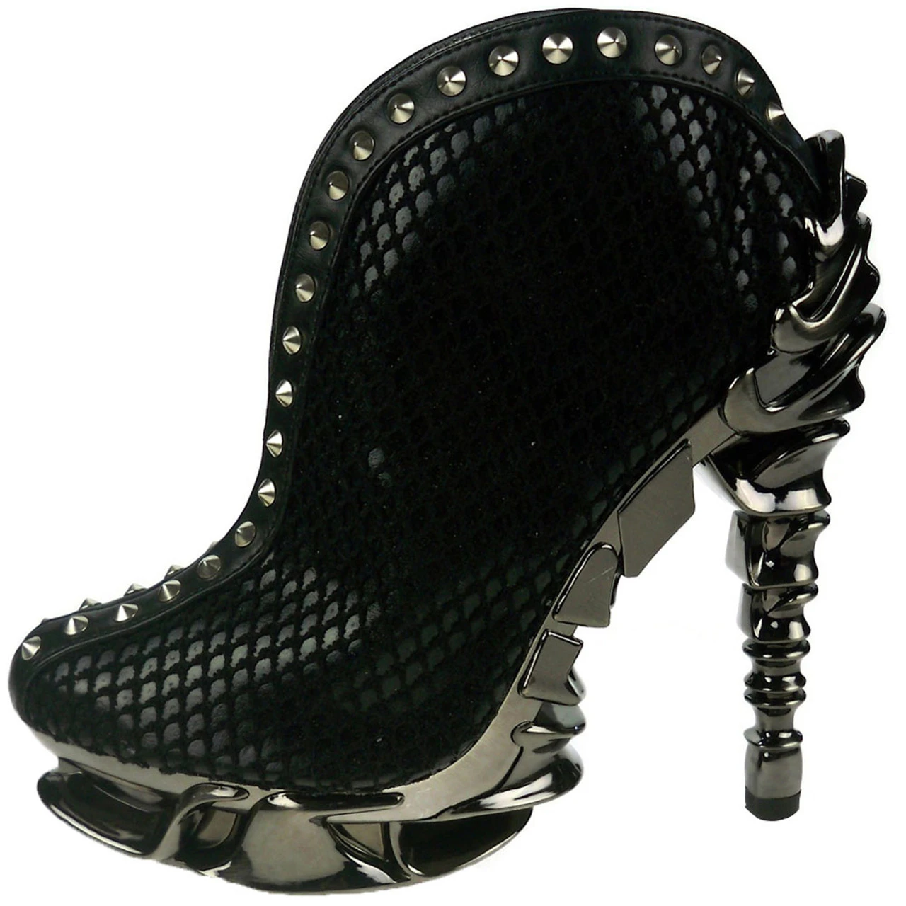 Hades Footwear | VESPER Slip on this sexy and curvy booties with shiny, black, two layered reptile print. Small metal studs line the center from top to bottom of the boot. Easy to walk in with Hades signature 5″ spinal heel with 1.5″ bone platform.