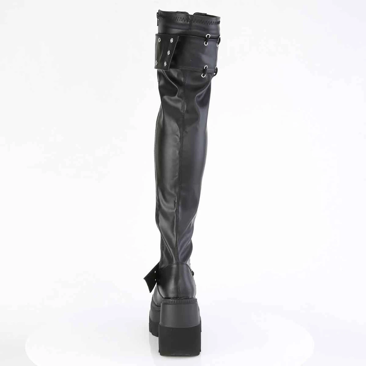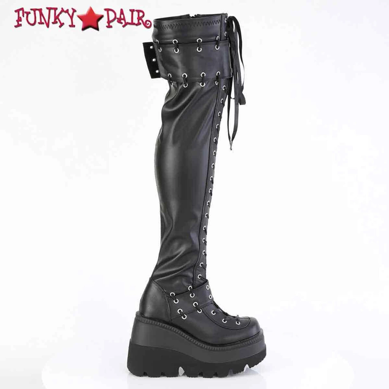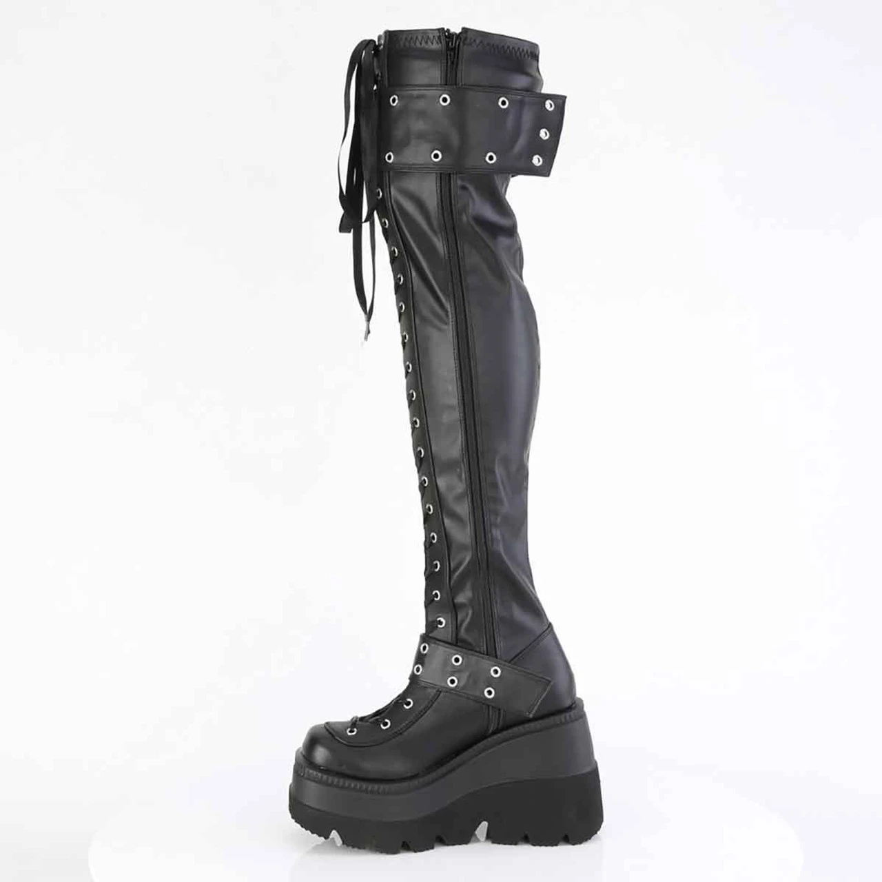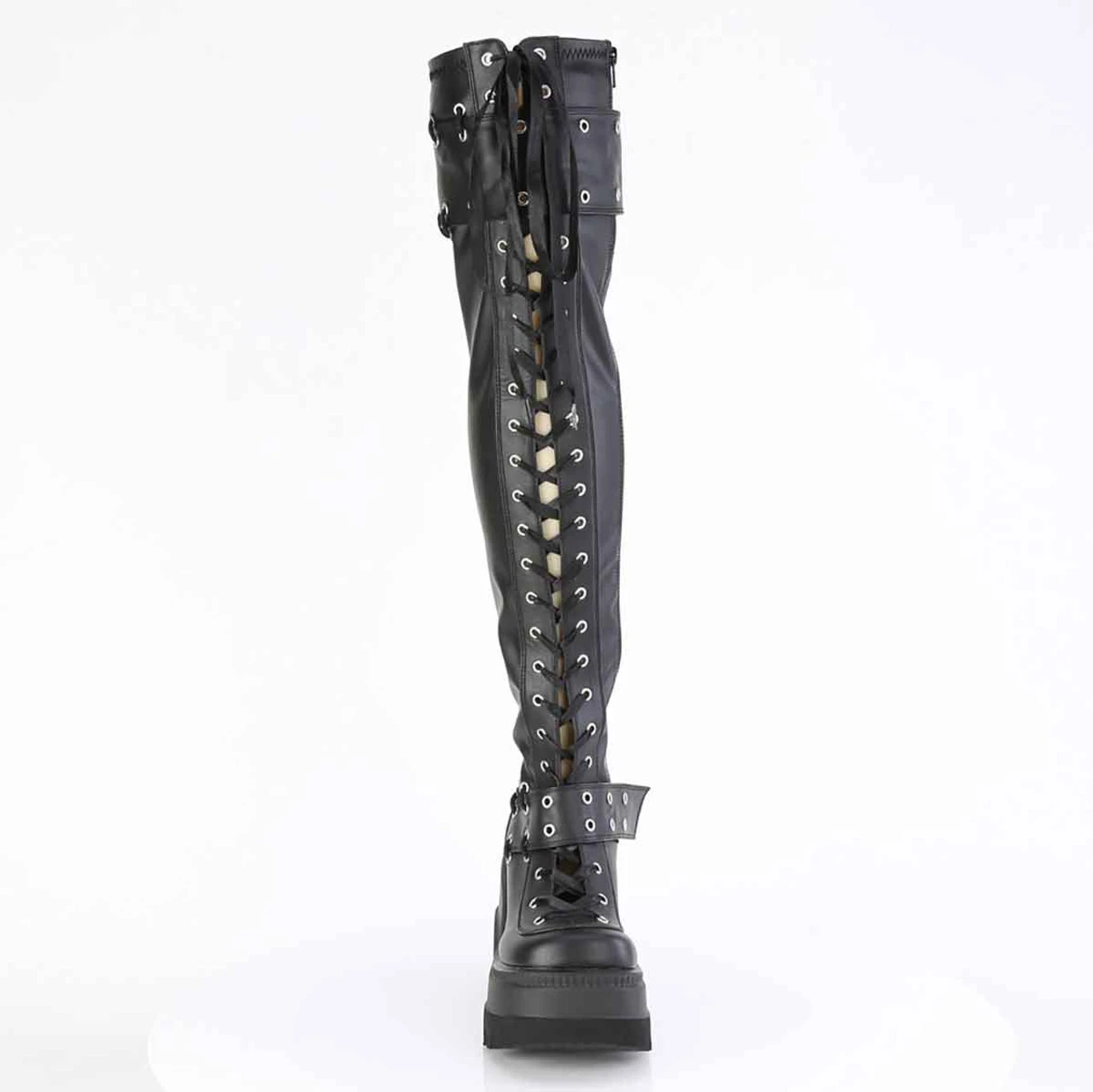 4 1/2″ (114mm) Wedge Platform Front Open Lace-Up Stretch Thigh High Boot Featuring w/ Hook-N-Loop straps , Full Length Inner Side Zip Closure