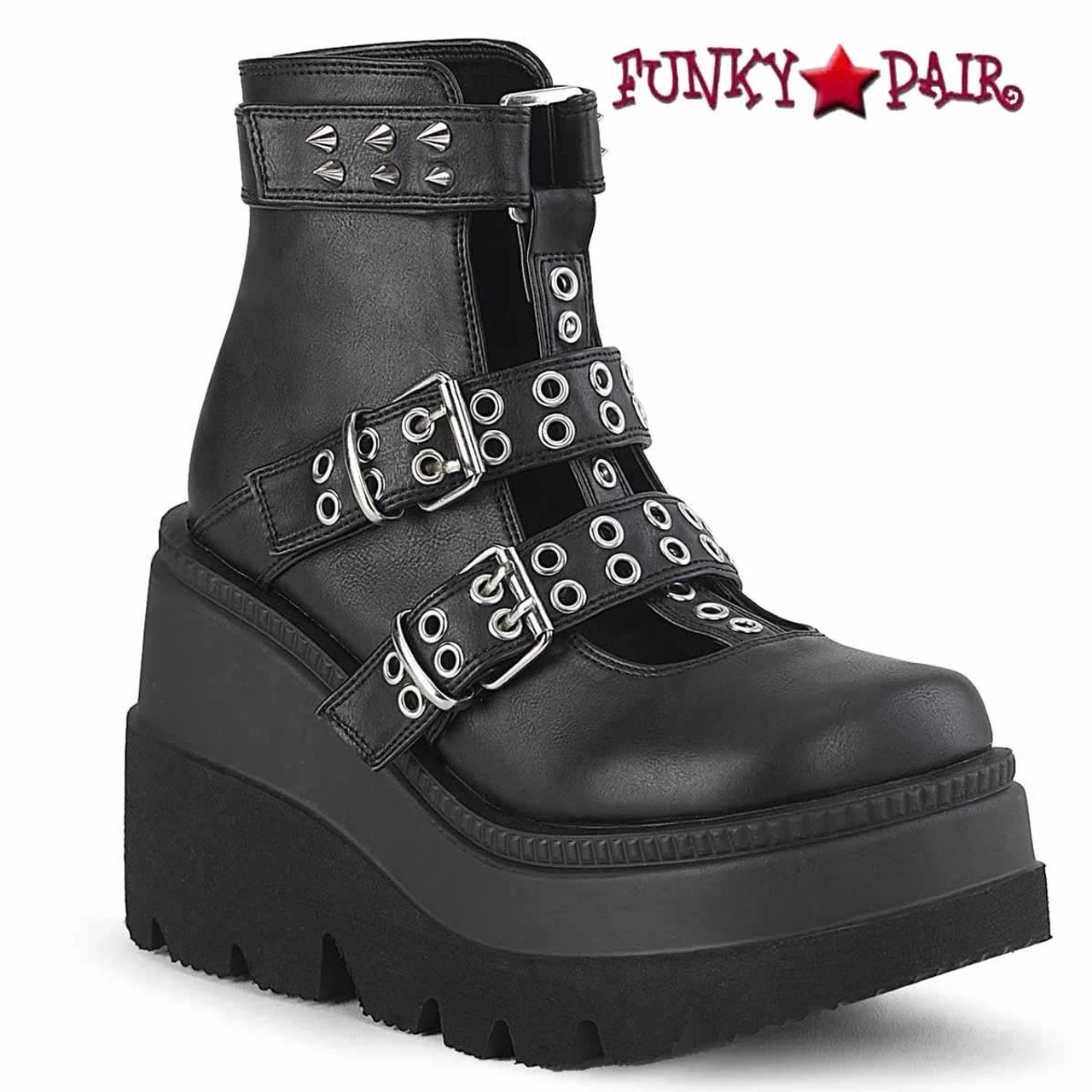 The SHAKER-62 is perfect for bold fashion statements. It features a 4 1/2″ (114mm) wedge platform cage bootie for stability, double grommet buckle straps for an adjustable fit, and a cone spike hook-n-loop top strap to provide a secure closure. Complete with a metal back zip closure, this boot is definitely a classic.