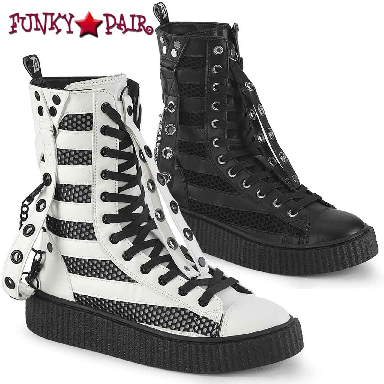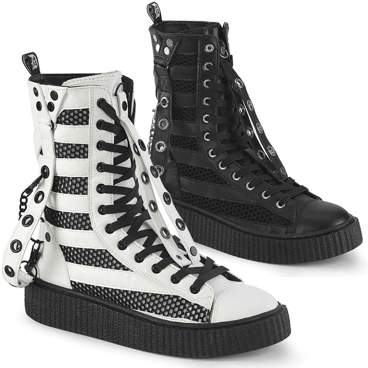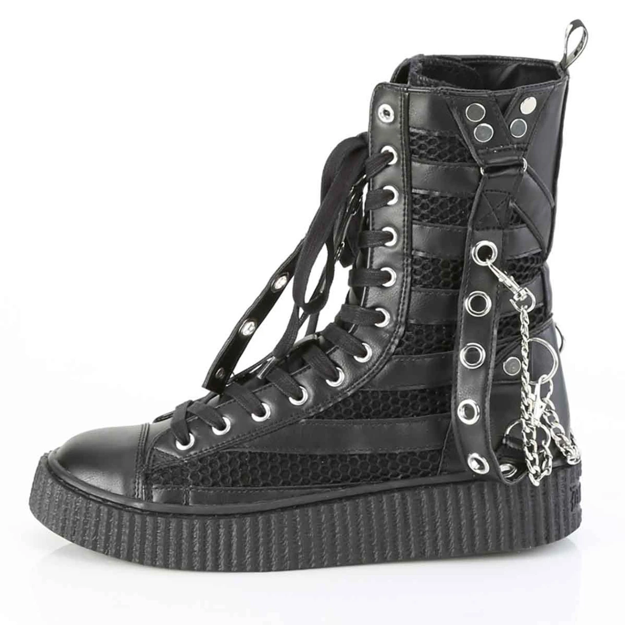 1 1/2″ (38mm) Platform Rubber Sole Round Toe Lace-Up Front Mid-Calf Creeper Sneaker Boot Featuring Stripped Contrast Side Panels and Riveted Handing Strap & Chain Details, Full Inner Side Metal Zip Closure Closure