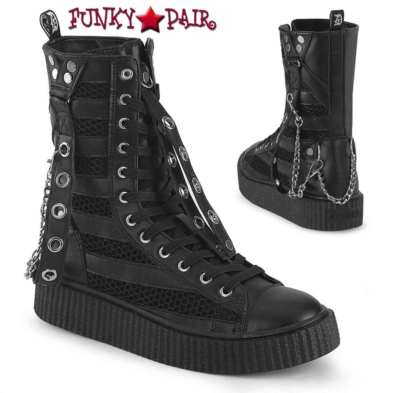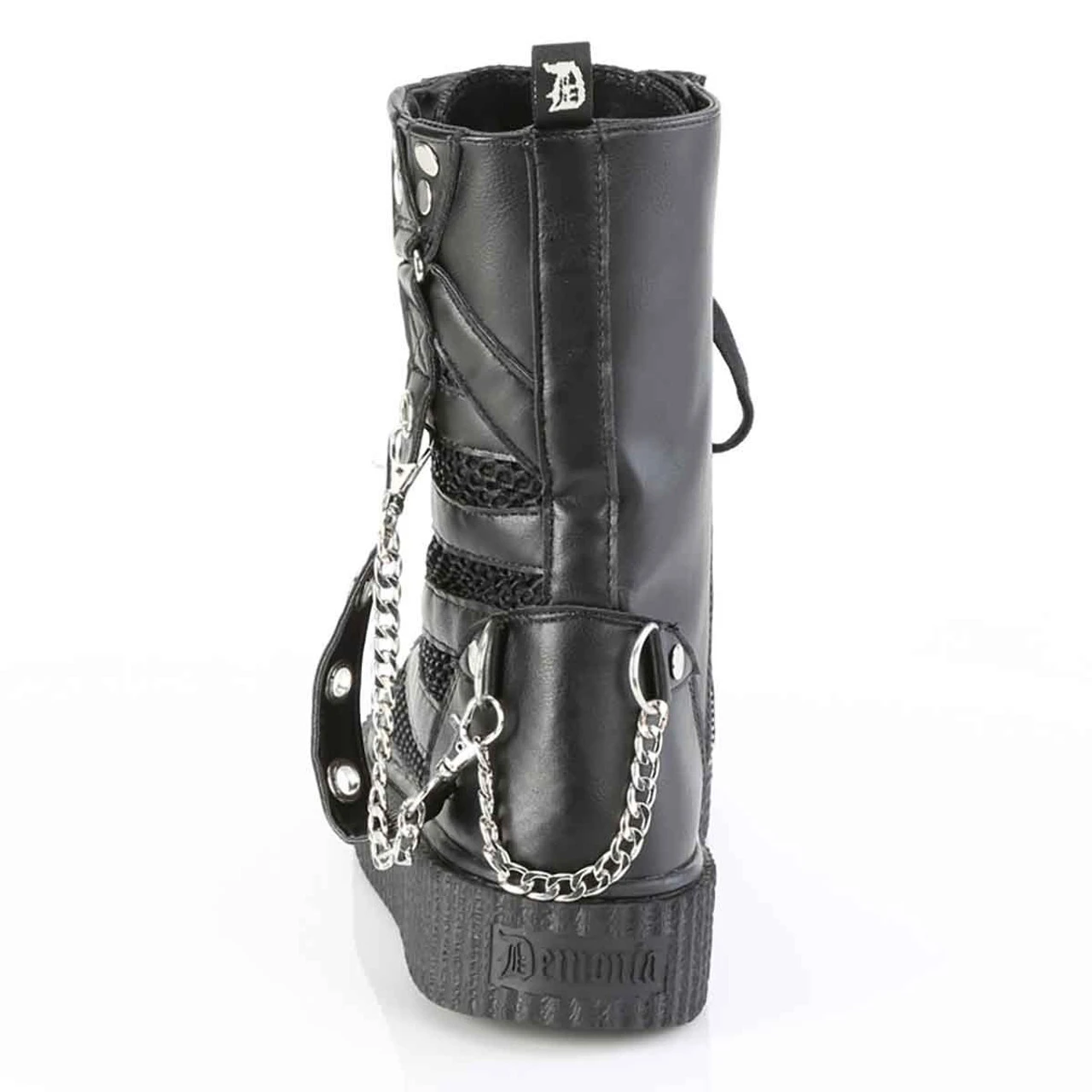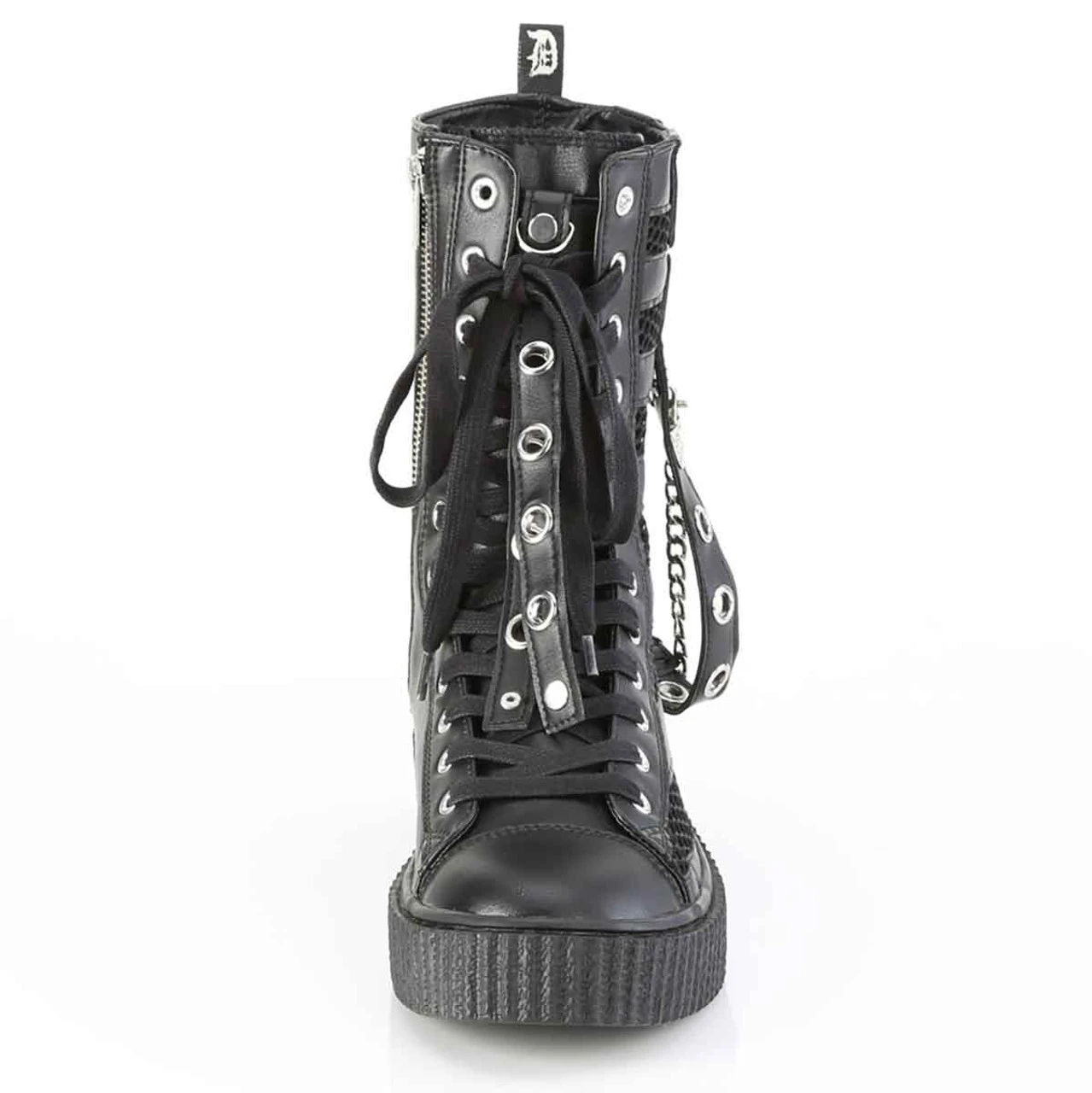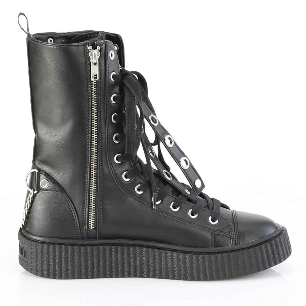 1 1/2″ (38mm) Platform Rubber Sole Round Toe Lace-Up Front Mid-Calf Creeper Sneaker Boot Featuring Stripped Contrast Side Panels and Riveted Handing Strap & Chain Details, Full Inner Side Metal Zip Closure Closure