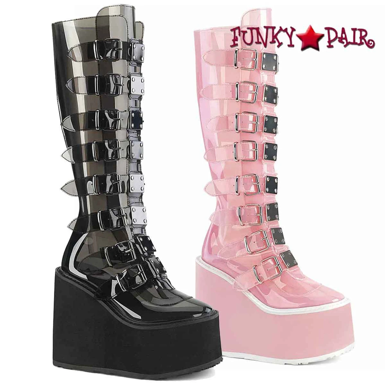5 1/2″ (140mm) Platform Knee High Boot Featuring 8 Buckle Straps w/ Metal Plates at Center, Back Metal Zip Closure
