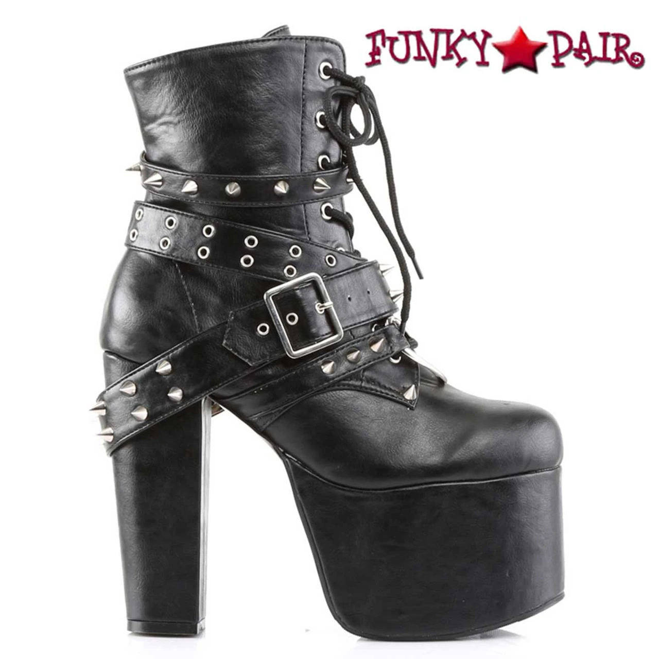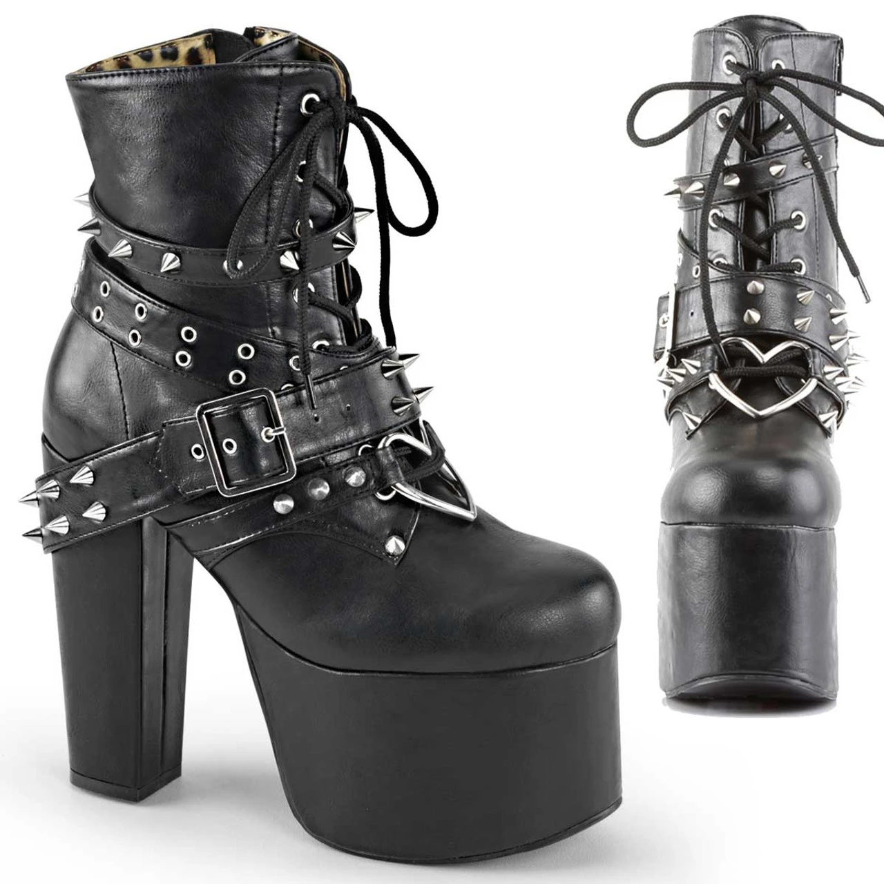 Step into style with the Torment-700 ankle boots! Featuring a 5.5 inch heel, 3 inch platform, and a daring laced-up front with wrap-around straps, spikes, eyelets, and a heart O-ring on the vamp, these boots make a statement. With an inside zip closure to ensure a snug fit, you’ll be turning heads in no time! Perfect for any occasion.