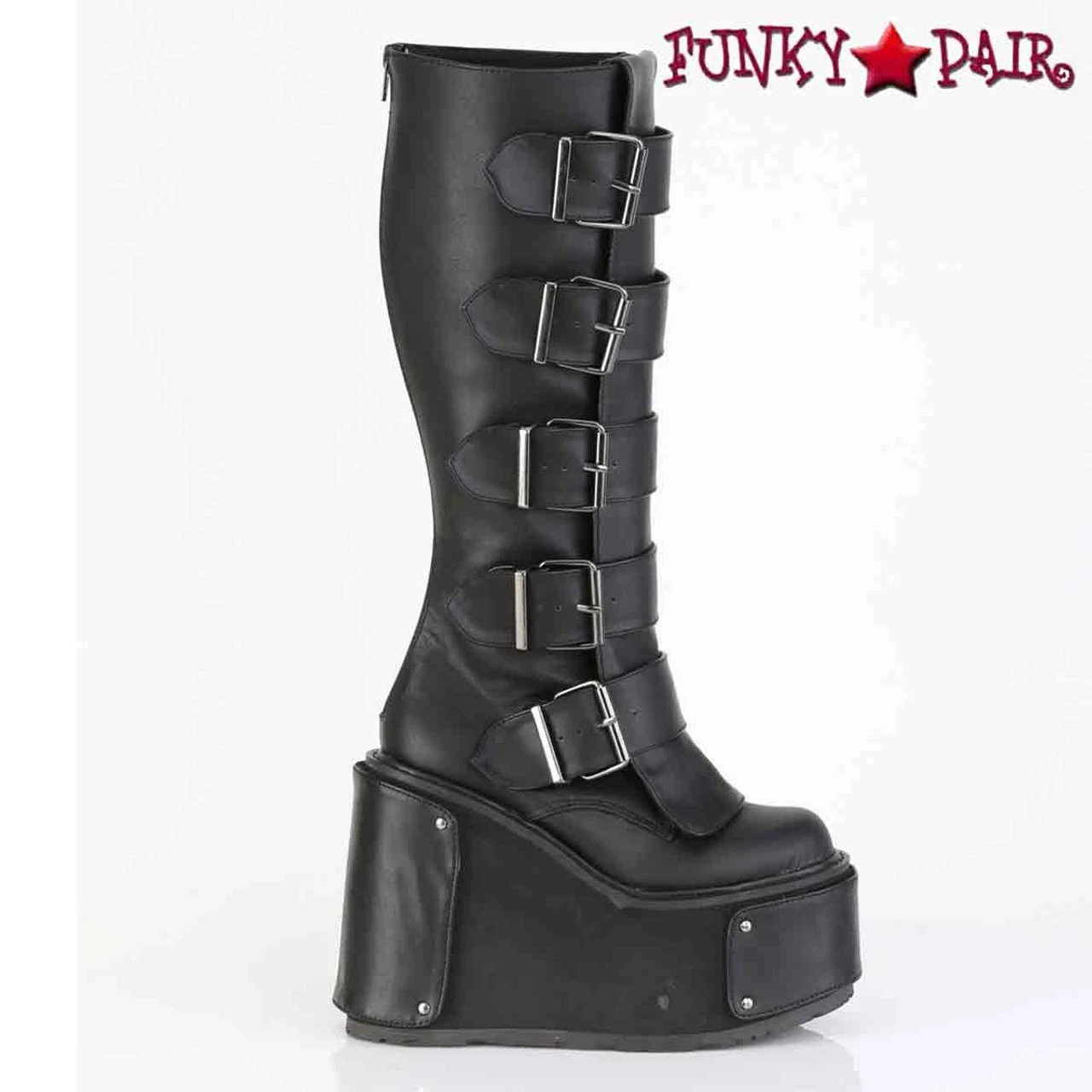 5 1/2″ (140 mm) Wedge Platform Lace-Up Knee High Boot Featuring 4 Interchangeable Hook-N-Loop Front Platform & Center Lacing Cover Panels w/ Plane, Flame, Rubber Spiked & Embossed Pyramid Studded Panels , Back Metal Zip Closure