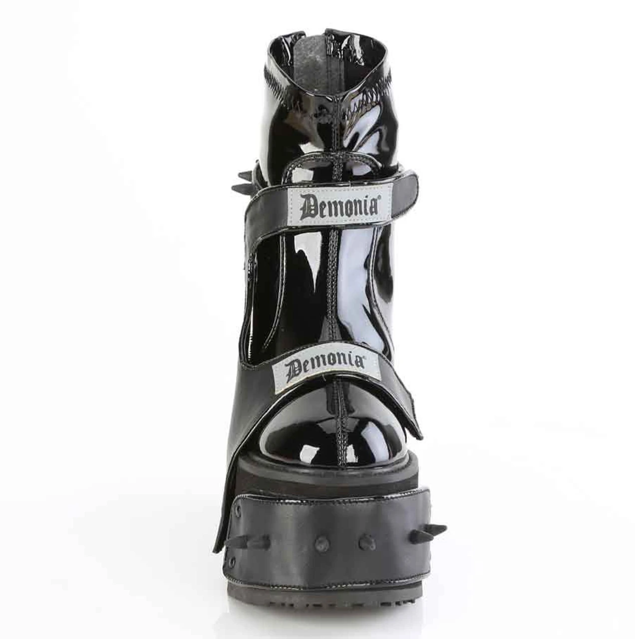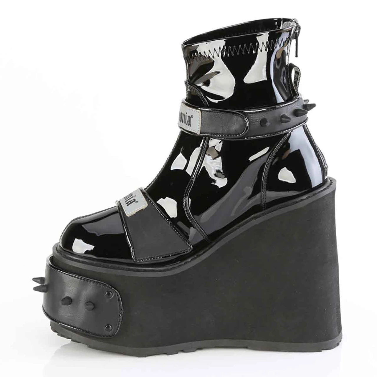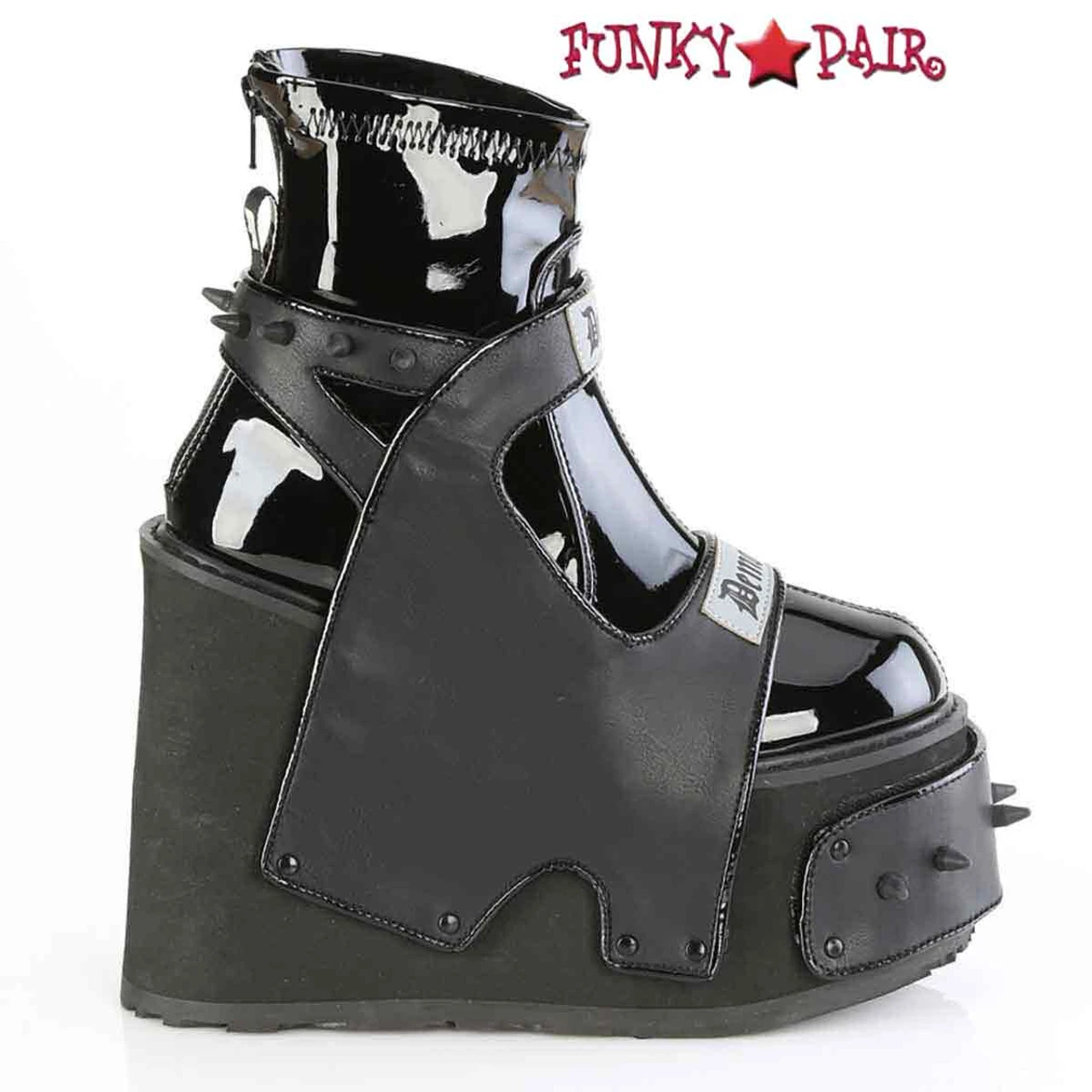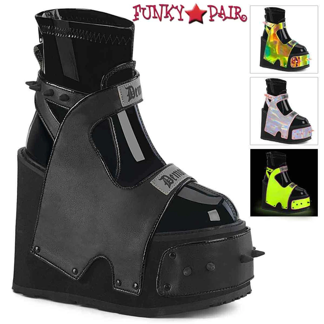 5 1/2″ (14cm) Wedge Platform Stretch Ankle Boot Featuring 4 Interchangeable Hook-N-Loop Front Platform Panels & Harness Panels w/ Reflective Logo & Rubber Spike Studs Details , Back Metal Zip Closure
