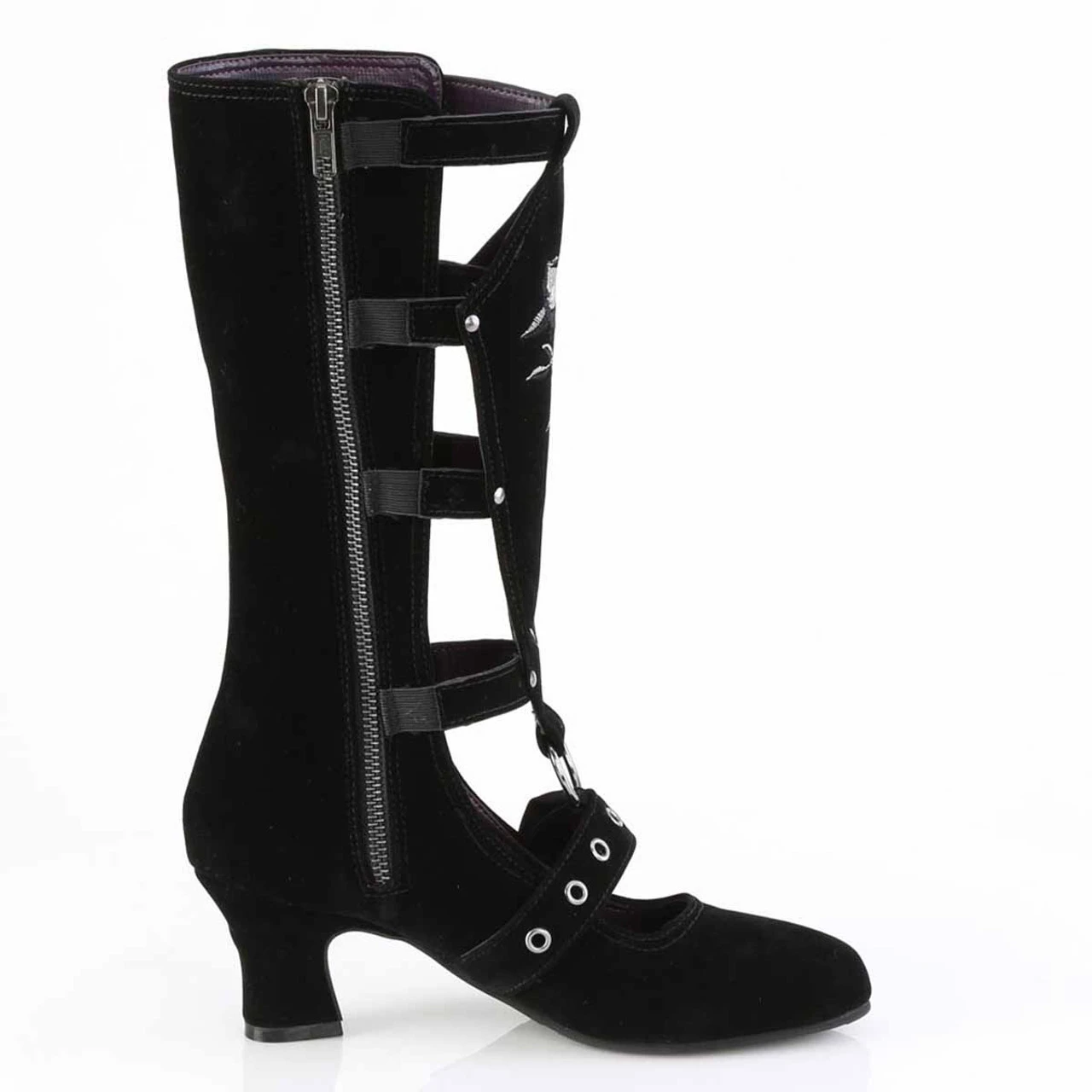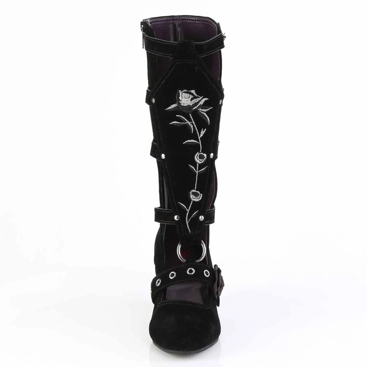 2 1/2″ (64mm) Heel Mid-Calf Boot Featuring Embridoered Rose Coffin Shaped Front Shield w/ Elastic Rose Buttons, Full Inner Side Zipper